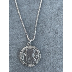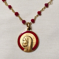 Virgin of the Lilies Medal made in France $49.95 |  Virgin of the Stars Medal on Matching Chain $52.00 |  Virgin of the Stars Beige Medal on 27" Chain $52.00 |  Virgin Mary w/ Lilies Sterling Silver French Medal $38.00 |