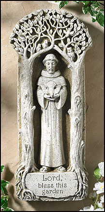 Saint Francis Plaque for Home or Garden. With inscription " Lord bless this garden". Lovely detailed image of St Francis holding a dove, the symbol of peace. Indoor or outdoor statue Resin -- 6.25" W x 2" D x 15" H