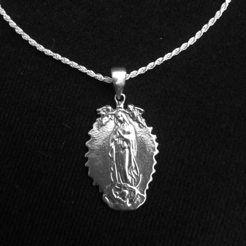 Our Lady of Guadalupe Sterling Silver Medal 1", with 27" sterling silver loop chain, very sturdy, and a lengthy 27". Price includes shipping.