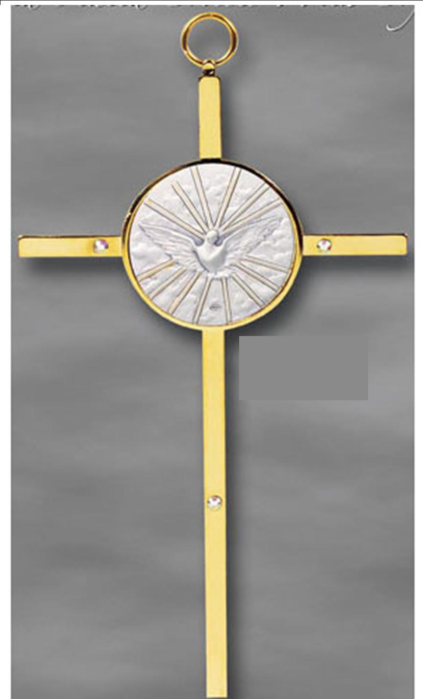 Holy Spirit gold plated cross embellished with crystals. 5"H A lovely gift for Confirmation Description: A great gift for special occasions giving feature top quality Italian sterling silver inspirational images on wall crosses or miniature keepsake boxes, ideal for a rosary, perhaps a tooth, or other secret treasures. Boxed. -- Gold Plate/Crystals -- 5" H