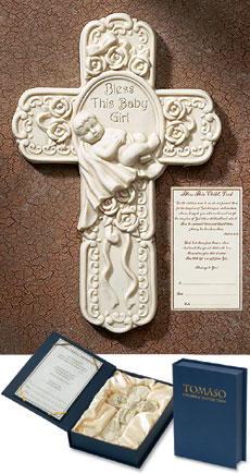 Bless this Baby Girl Cross. This beautiful cross comes in an elegant presentation box with a certificate to commemorate memories of this special gift to baby. Cross is gently placed in a custom-fit bed lined in cream satin.