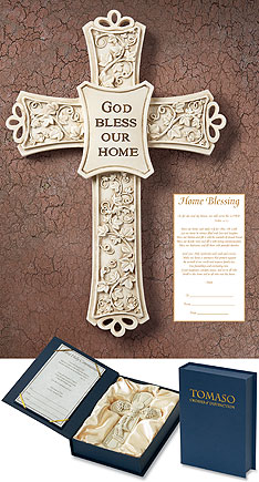 Home Blessing Cross inscribed “God Bless our Home”, is gift boxed and accompanied by a presentation certificate with place to commemorate this special day Card reads: As for me and my house, we will serve the LORD. Joshua 24:15 Bless our home, and make it fit for Thee, Oh Lord. Let our home be always filled with love and laughter. Bless our kitchen and fill it with the warmth of shared bread. Bless our family room and fill it with loving communication. Bless our bedrooms and fill them with peaceful slumber. Send your Holy Spirit into each nook and cranny. Make our home a sanctuary that protects against the turmoil of our world and inspires family ties, true friendships,and everlasting love. Grant happiness, comfort, peace, and joy to all who dwell in this home and to all who visit this home. Amen Gift Boxed. 7.5" Resin