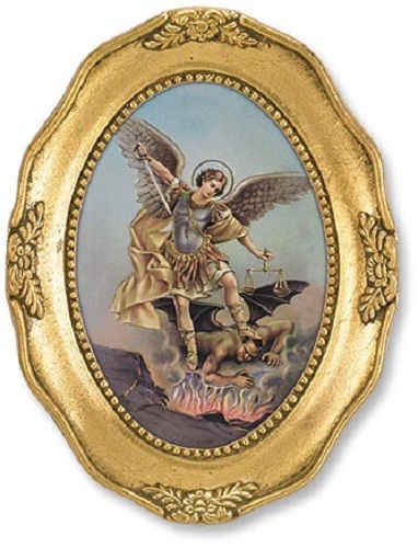 Gold foil embossed image of St. Michael the Archangel in a rich gold leaf frame. Easel Back and Metal Hooks for Wall Mounting. Oval print under glass. 3.5" W x 4.5" H. Gift Box.