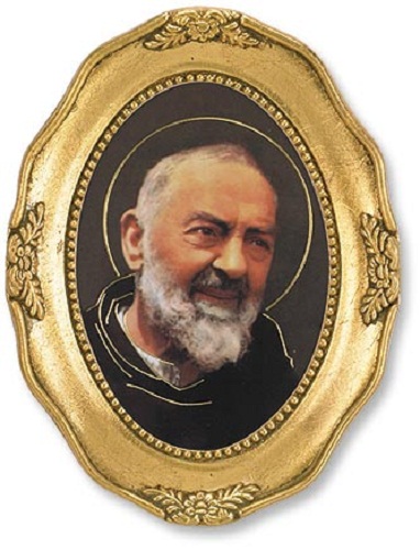 Gold foil embossed image of Padre Pio in a beautiful gold leaf frame. Easel Back and Metal Hooks for Wall Mounting. Oval print under glass. 3.5" W x 4.5" H. Gift Box.