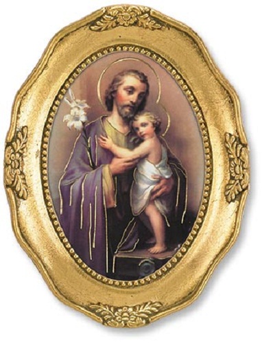 Gold foil embossed image of St. Joseph with Child Jesus in a rich gold leaf frame. Easel Back and Metal Hooks for Wall Mounting. Oval print under glass. 3.5" W x 4.5" H. Gift Box.