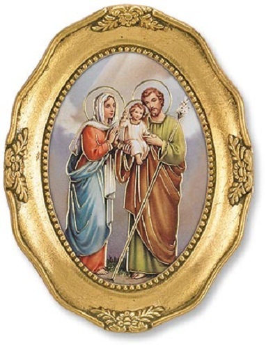 Gold foil embossed image of The Holy Family in a rich gold leaf frame. Easel Back and Metal Hooks for Wall Mounting. Oval print under glass. 3.5" W x 4.5" H. Gift Box.