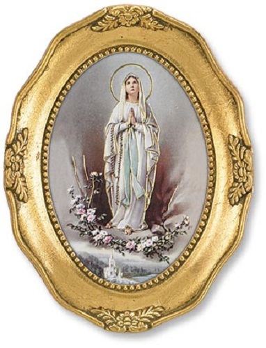 Gold foil embossed image of Our Lady of Lourdes in a beautiful gold leaf frame. Easel Back and Metal Hooks for Wall Mounting. Oval print under glass. 3.5" W x 4.5" H. Gift Box.