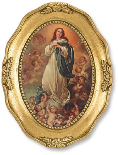 Gold foil embossed image of The Assumption in a beautiful gold leaf frame. Easel Back and Metal Hooks for Wall Mounting. Oval print under glass. 3.5" W x 4.5" H. Gift Box.