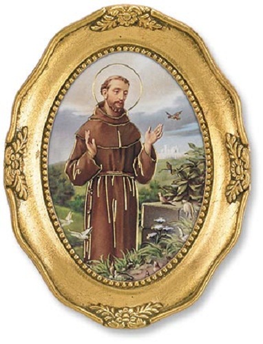 Gold foil embossed image of St. Francis of Assisi in a rich gold leaf frame. Easel Back and Metal Hooks for Wall Mounting. Oval print under glass. 3.5" W x 4.5" H. Gift Box.