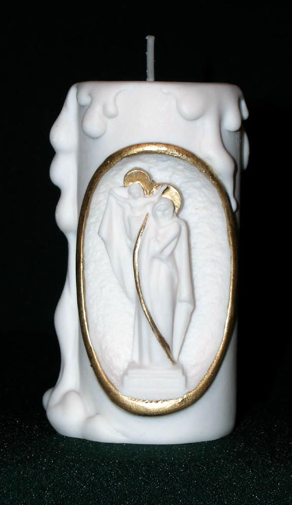 Madonna and Child white alabaster votive candle with gold trim and a replaceable tealight, 4". *********** Made in Italy.