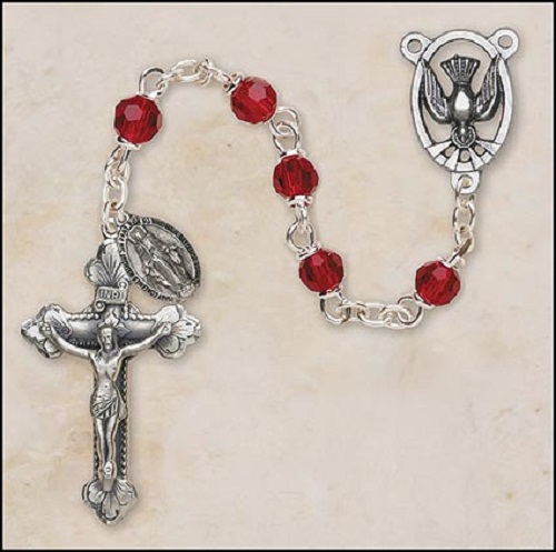 The Spirit helps us in our weakness; for we do not know how to pray as we ought, but the Spirit himself intercedes for us with sighs too deep for words." - Romans 8:26 Italian-crafted with Holy Spirit dove centerpiece, this beautiful loc-link, crystal rosary makes an excellent gift for those making their Confirmation. Highly detailed crucifix and Miraculous Medal attached to rosary. Comes packaged in a beautiful hinged jewelry box. -- 6MM Ruby -- 1 3/4" Crucifix