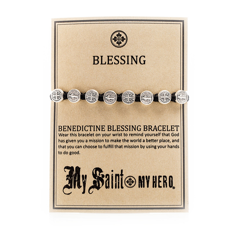 GIVE THE GIFT OF A BLESSING This Blessing Bracelet is hand woven in Medjugorje featuring 10 Benedictine medals and our signature “blessed” tag. Each bracelet comes on a card telling the story of Medjugorje and the powerful protection of the Benedictine medal. The sliding slipknot closure, enables them to fit nearly everyone perfectly.