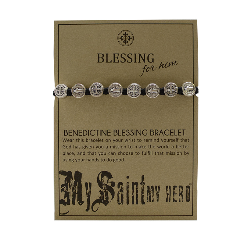 GIVE THE GIFT OF A BLESSING This Blessing Bracelet is hand woven in Medjugorje featuring 10 Benedictine medals and our signature “blessed” tag. Each bracelet comes on a card telling the story of Medjugorje and the powerful protection of the Benedictine medal. The sliding slipknot closure, enables them to fit nearly everyone perfectly.