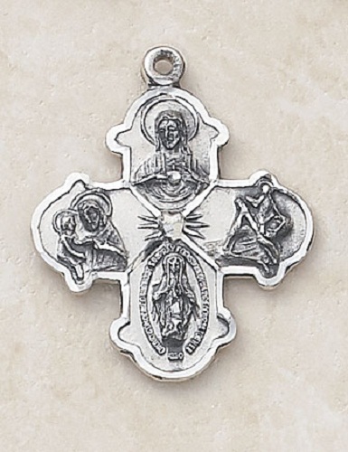 A simply beautiful, detailed, Sterling Silver, Four Way medal made by Italian artisans. Cross pendant has four medals in one; Sacred Heart, St. Christopher, Miraculous Medal, St. Joseph. On the back is a message in case of emergency: I am a Catholic. Please call a priest. Comes with a genuine rhodium-plated 24" chain and is beautifully gift boxed. Makes a great gift for Confirmation, First Communion, Father's Day, Any Occasion. Perfect for older boys and men. Sterling Silver -- 1 1/8" H, 24" L Chain