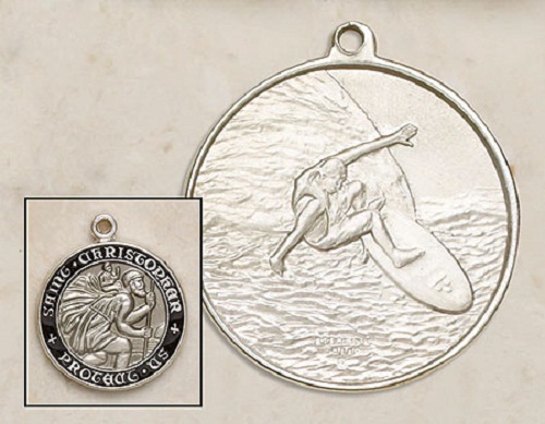 Men's Titanium 1"D Medal has St. Christopher on one side and Shortboard Surfer on the other. Comes with sturdy 20" Rhodium Steel chain. Gift boxed. Great gift for your favorite surfer!
