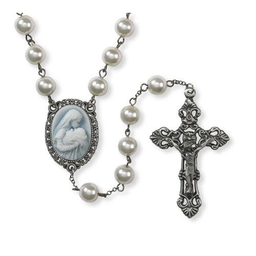 This gorgeous cameo image of Madonna and Child has been carefully designed, providing fine detail and ornate embossing. Exclusive art from Michael Adams makes this collectible "Mother's Kiss" rosary a wonderful gift, especially for moms or moms to be. Boxed. Ornately designed Crucifix, 7mm faux pearl white beads, 22.5"L.