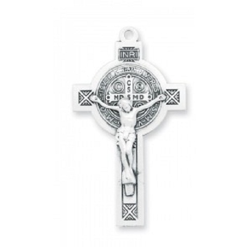 Beautiful Sterling Silver Crucifix has embedded St. Benedict Medal. Highly Detailed Front and Back. Sterling Silver Crucifix is 2"H on a Sturdy 24" L Rhodium Steel Chain. Boxed in Velveteen Blue Hinged Box. Makes a Great Keepsake Gift for Confirmation Boy, Father's Day, RCIA, or Any Occasion.