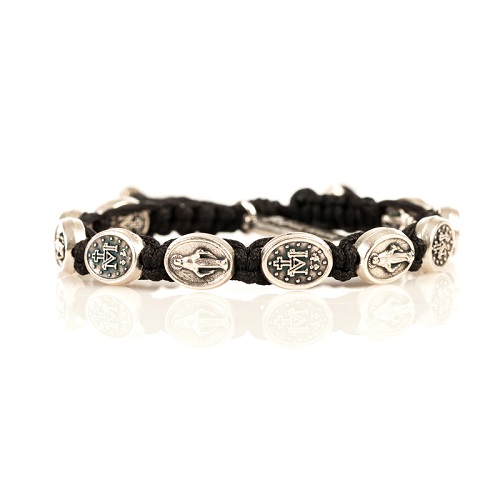 MIRACULOUS MARY BLESSING BRACELET While wearing this hand-woven Mary Blessing Bracelet may you be blessed by Mary's loving protection and preserved in the grace of her Son. Marian Bracelets for Men and Women on adjustable bracelet cording which opens to 9.5" diameter, closes to 6.25" Handwoven in Medjugorje, Bosnia, and Herzegovina 10 silver or gold-tone Miraculous Medals and a "blessed" tag Medals made in Italy Miraculous Mary Blessing Bracelet comes on an Inspirational card that tells the story of the Catholic Miraculous Medal