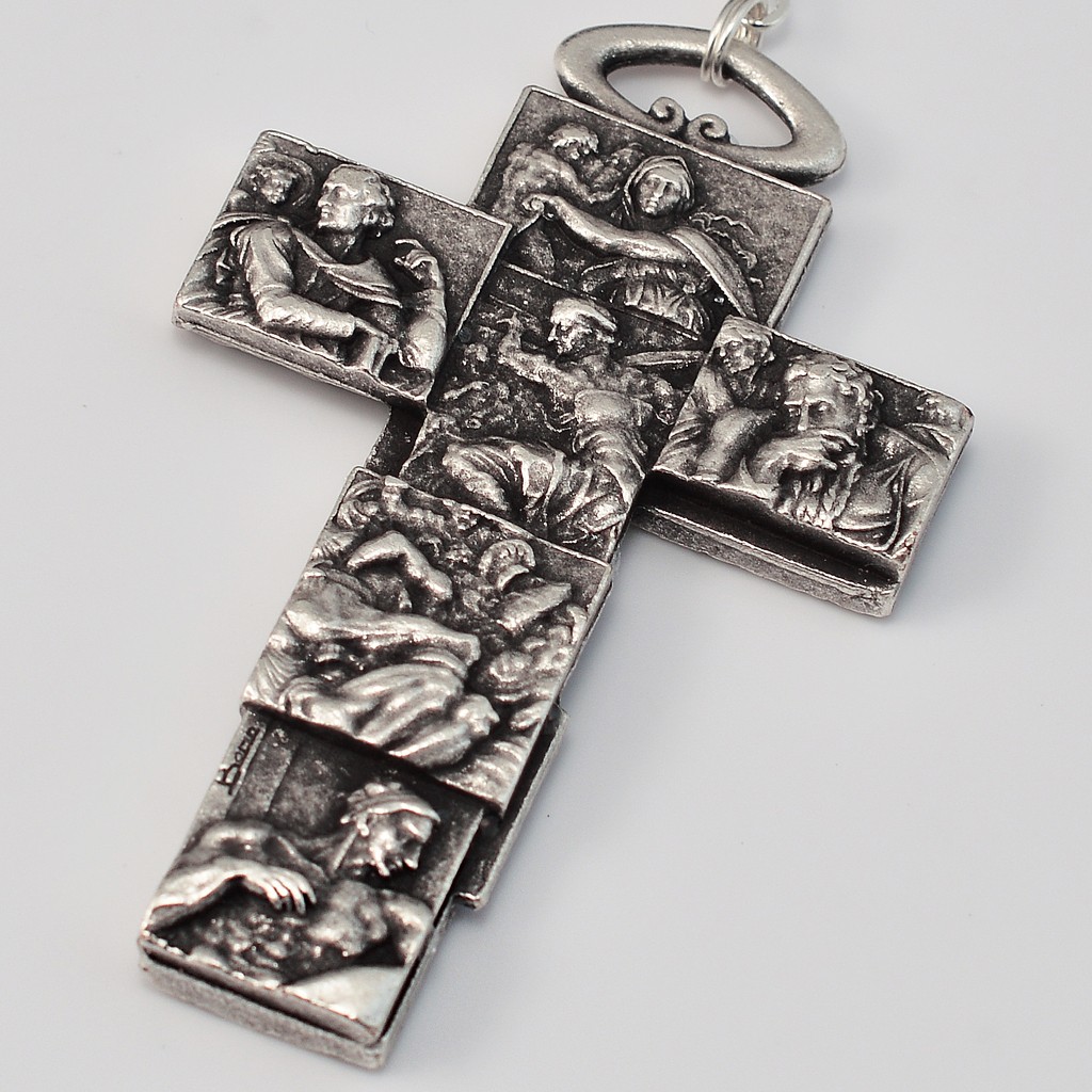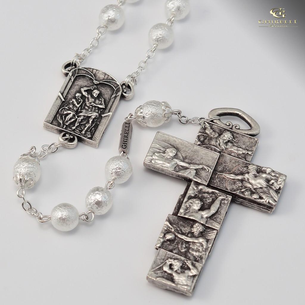 This beautiful rosary by Ghirelli features 8 mm white Bohemian glass beads with antique pearl finish, silver plated, capped Our Father beads and the Ghirelli brand plate. “The Last Judgement” Centerpiece is a reproduction of the famous masterwork by Michelangelo. The shape reproduces the architecture of the Sistine Chapel in a suggestive perspective. The “Sistine Chapel” Cross has small, highly detailed, panels featuring sculptures on both sides taken from the frescoes by Michelangelo on front and back. Made in Italy. This stunning Rosary is presented in an exclusive gift box with an original design by Ghirelli. The graphics on the box are characterized by the renowned “The Creation of Adam” by Michelangelo. Makes a beautiful keepsake gift.