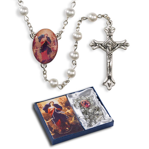 Mary Untier of Knots Rosary Gift Set Gift Box Includes Holy Card of Mary Untier of Knots and Beautiful Rosary w/ 6 mm Faux Pearl Bead 17" L Mary Untier of Knots is a A Favorite Devotion of Pope Francis! Makes a lovely and meaningful gift for any occasion!