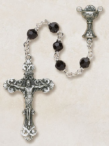 Beautiful Italian Rosary with 6 mm Black Beads. Lovely detailed Crucifix and centerpiece of Chalice with Host. Makes a treasured keepsake. Made in Italy. Gift boxed.