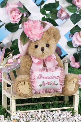 " Greatest Grandma" Bear by Bearington is the perfect keepsake gift for Grandma. This beautiful, plush, tanbear has hinged joints and all of the quality and detail Bearington Collectible bears are known for. This Grandma bear is all decked out for Mother's Day in a pink hat with vintage flower accent and a matching pink ribbon bow tied at the neck. In her hands she holds a plush pink pillow with ruffled edge and the name"Grandma " above embroidered satin rosebuds. This bear is the gift your child will love to give to Grandma, for Mother's Day, Birthday, Valentine's Day or just because! It is sure to become a treasured keepsake. 10"H