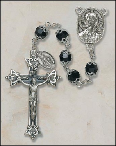 This beautiful Rosary honors the blessed devotion to the Sacred Heart with a detailed centerpiece of the image of Jesus. Each 7MM Austrian Crystal Black Bead is ornately double capped. A 2"H Italian Heritage Crucifix and antique style Miraculous Medal dangle make this Rosary a lovely keepsake gift to be treasured always. The Sacred Heart is one of the most widely known devotions in the Catholic Church among both men and women. The devotion originated in the 17th century when the French nun, Sister Marguerite Marie Alacoque, detailed several visions of our Lord that she experienced while deep in prayer. Today, her visions are represented in the detailed artistic representation of the Sacred Heart of Jesus. Vienna Double Capped Austrian Crystal Rosaries -- 7MM Black 2" Crucifix - Gift Boxed