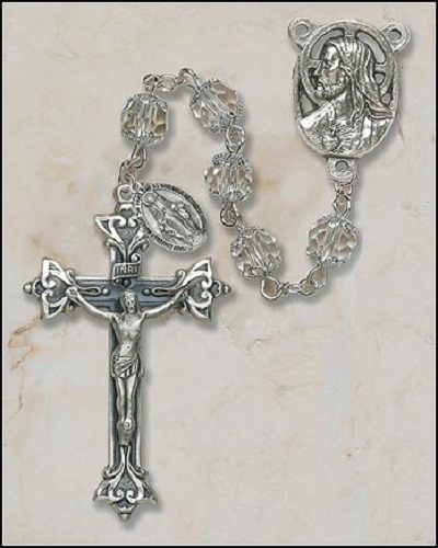This beautiful Rosary honors the blessed devotion to the Sacred Heart with a detailed centerpiece of the image of Jesus. Each 7MM Austrian Crystal Bead is ornately double capped. A 2"H Italian Heritage Crucifix and antique style Miraculous Medal dangle make this Rosary a lovely keepsake gift to be treasured always. The Sacred Heart is one of the most widely known devotions in the Catholic Church among both men and women. The devotion originated in the 17th century when the French nun, Sister Marguerite Marie Alacoque, detailed several visions of our Lord that she experienced while deep in prayer. Today, her visions are represented in the detailed artistic representation of the Sacred Heart of Jesus. Vienna Double Capped Austrian Crystal Rosaries -- 7MM Crystal 2" Crucifix - Gift Boxed
