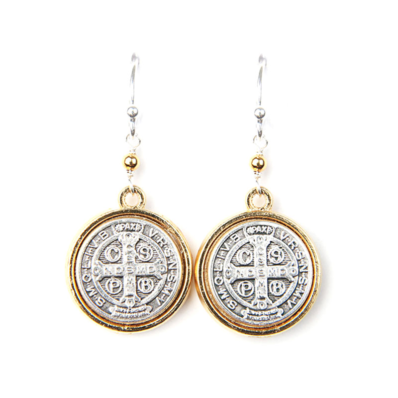 BLESSING Wear these Benedictine Cross earrings as a special protection and reminder that God has given you a mission to make the world a better place. 1.25″ Two Tone Benedictine Cross medals on hypoallergenic wires. Gift packaged