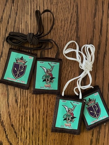 This is a traditional Brown Scapular made of 100% wool. It bears the image of St. Michael the Archangel. You must be enrolled in the Brown Scapular by any priest to obtain all the promises associated with wearing it faithfully. This scapular also has a St. Benedict medal attached. I call these my "Industrial Strength Scapulars" because of their durability and longevity! Please indicate white or brown cord when ordering or by message.