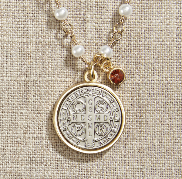 Powerful St. Benedict Medal hangs from 16" faux pearl and gold tone chain. A 3L" extender is included with linen bag for safe keeping. Made of mixed metals, the dime-sized St. Benedict medal is rimmed and backed in a gold tone that accentuates the detail of the medal. An amber colored Swarovski crystal dangles next to the medal. Really a lovely piece of religious jewelry. Makes a perfect gift for Confirmation, First Communion, Mother's Day, or any occasion.