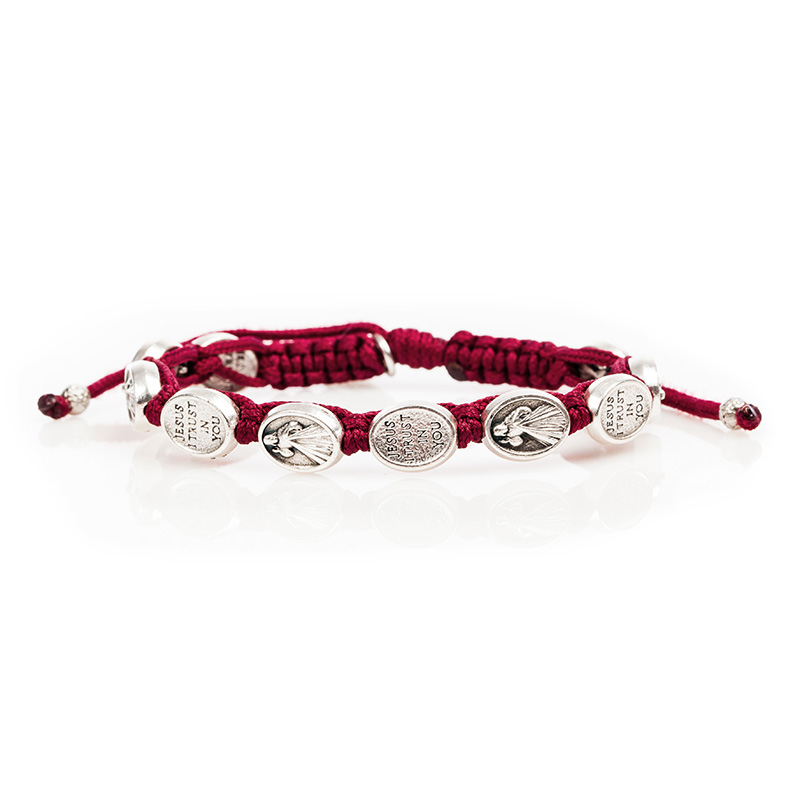 “Jesus I trust in you”… pray these five powerful words as you grasp each medal one by one. Allow the word TRUST to cast away any doubt and bring you to the foot of the Cross, with your gaze lifted to Christ: let yourself feel the power of His Divine Mercy flowing from His heart into yours. Handwoven in Medjugorje each blessing bracelet is made using 10 silver plated Divine Mercy Medals and features a “trust” tag. Divine Mercy comes on a card which tells the story of the Divine Mercy. The sliding slipknot closure enables them to fit nearly everyone perfectly. Medals made in Italy. Choose a color in Silver/Black, Silver/Red or Silver Navy.