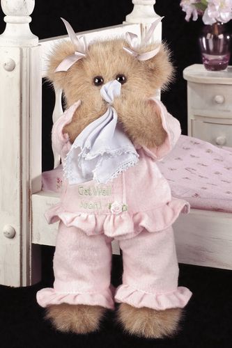 Sicky Vicky is dressed in pink pajamas that bear the message "Get Well Soon." Jointed head, arms and legs make this adorable bear pose-able and the perfect roommate. Send your get well message with this sweet, cuddly little bear. It is sure to make any illness seem more "bearable."