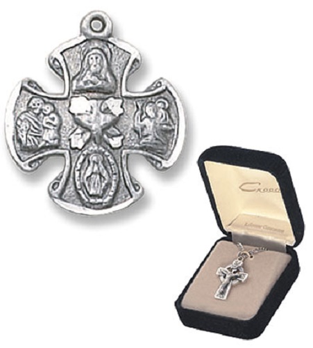A simply beautiful Four Way medal made by Italian artisans. Cross pendant has four medals in one; Sacred Heart, St. Christopher, Miraculous Medal, St. Joseph. On the back is a message in case of emergency: I am a Catholic. Please call a priest.This medal was handcrafted using the time-honored metals of Loreto with the beautiful silver oxidized finishes that only the Italians of Marchese province have perfected.Comes with a genuine rhodium-plated 18" chain and is beautifully gift boxed. Makes a great gift for Confirmation, First Communion, Mother's Day Oxidized Silver -- 3/4" H, 18" L Chain