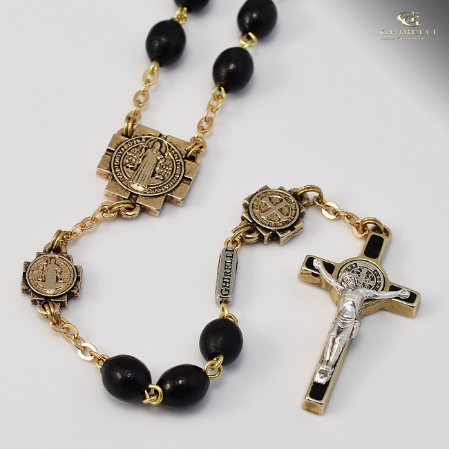 St. Benedict Rosary Made in Italy Antique Gold Plated Finish 8x6 mm Black Wood Beads Benedictine Crucifix Medal of St Benedict Centerpiece Medal of St. Benedict Our Father Beads Gift Boxed Perfect Gift for Confirmation, First Communion, RCIA, Father's Day
