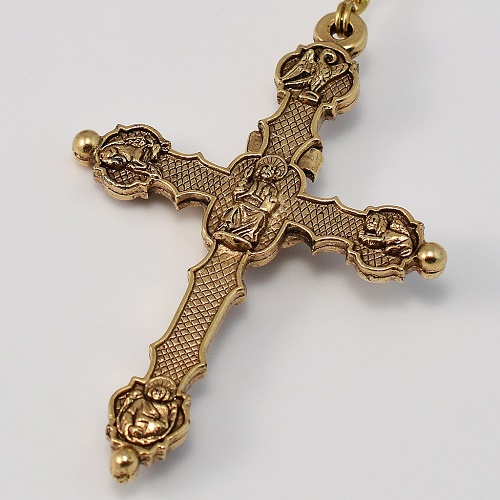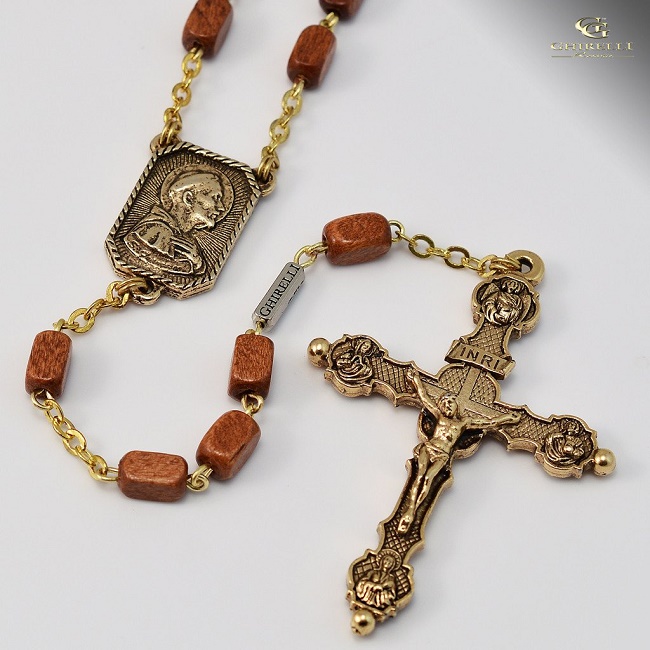 St. Francis of Assisi Rosary Made in Italy Antique Gold Plated Finish 8x5 mm Brown Wood Beads Crucifix Features Four Evangelists Christ Pantocrator & Four Evangelist's Emblems on Reverse Side St. Francis of Assisi Centerpiece St. Clare of Assisi on Reverse Side Gift Boxed Perfect Gift for Confirmation, First Communion, RCIA, Father's Day