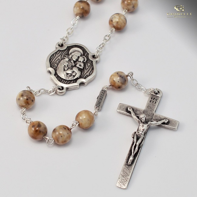 St. Joseph Rosary Made in Italy Silver Plated Finish 8 m Bohemian Glass Beads di Bohemia Beads in Brand New Hued Tan, Brown, Beige Colors Crucifix with reeded-smooth double effect in antique silver plated finish Centerpiece “Saint Joseph with the Child Jesus” in antique silver plated finish "St. Joseph Pray for Us" on Reverse side Gift Boxed Perfect Gift for Confirmation, First Communion, RCIA, Father's Day