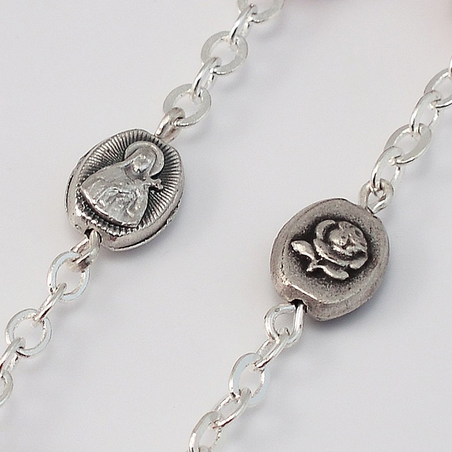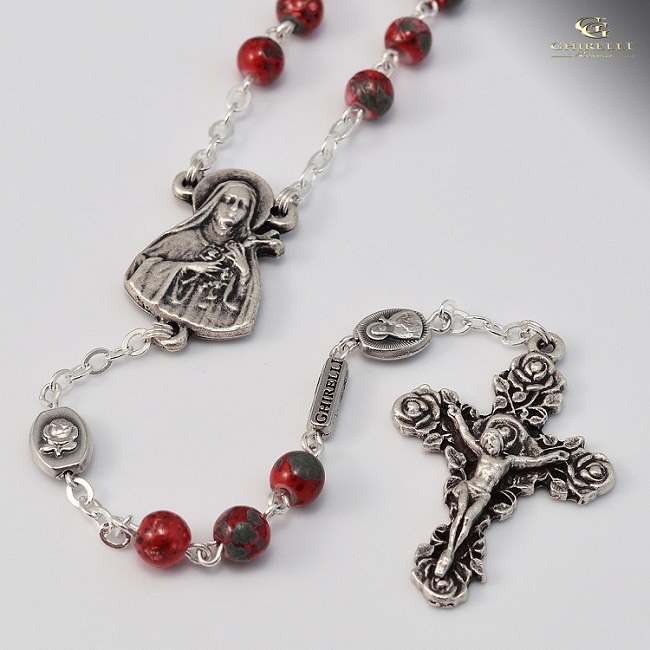 St. Therese of Lisieux Rosary Antique Silver Plated Finish Made in Italy 6 mm Glass Beads with Floral Decoration 8x6 mm St. Therese Medal in place of Our Father Beads Image of St. Therese on one side and a Rose on the reverse side St. Therese Centerpiece Crucifix with roses, inspired by the words of Saint Thérèse of Lisieux: “I will spend my heaven doing good on earth. I will send a shower of roses“ Gift boxed