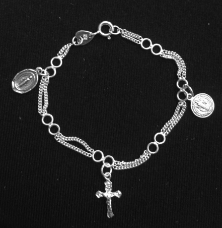 What a bracelet! Miraculous Medal, Crucifix and St. Benedict Medal on a dual chain/double loop bracelet all in sterling silver. 7" bracelet with links at 6.75" and 6.5" Price includes shipping.