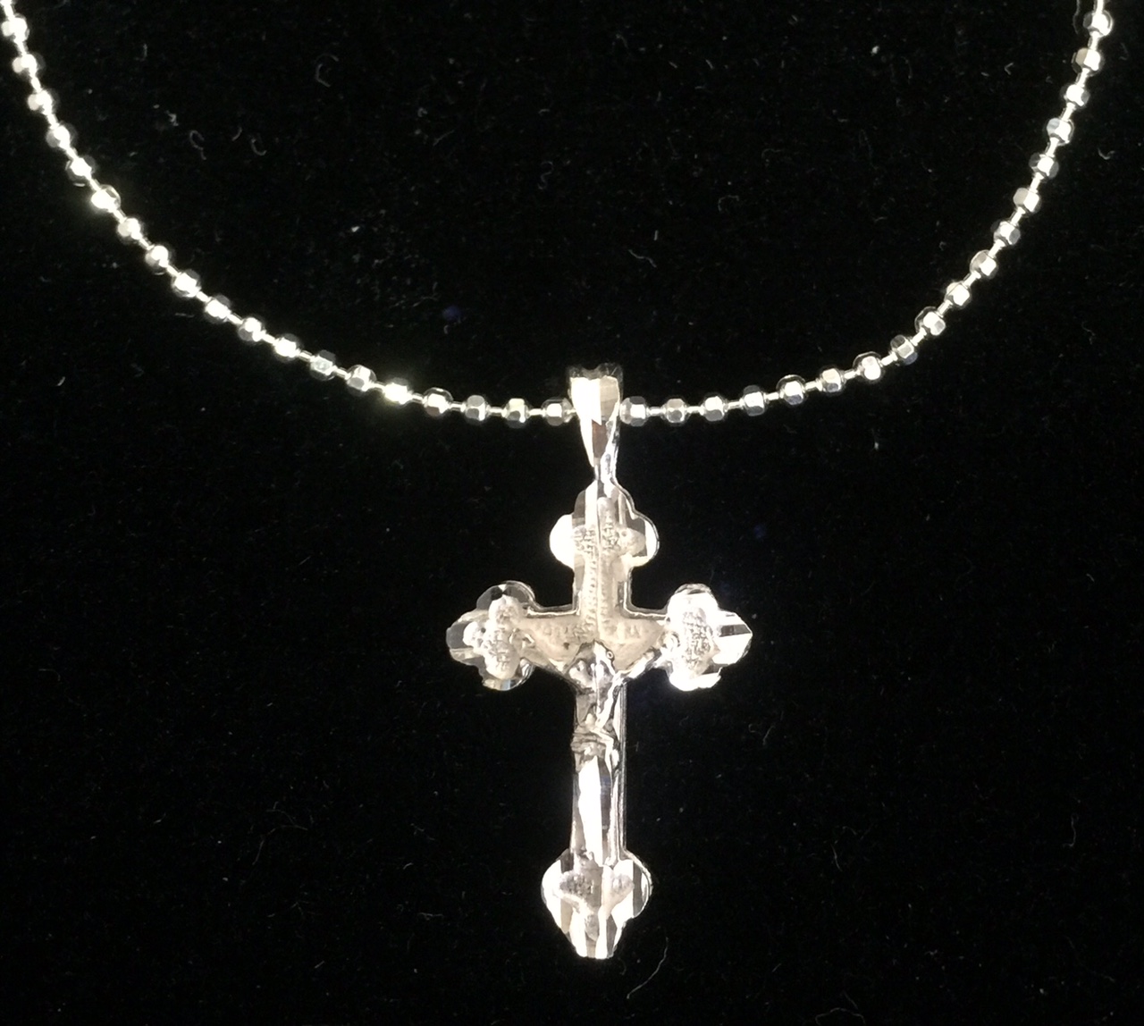 Beautiful Crucifix on 18" laser cut ball chain (adds a bit of sparkle), all Sterling Silver. Nice for First Holy Communion, Confirmation, even nice for an adult. 3/4" Crucifix with 1" drop. Other chain styles and lengths are available, please call or email for options and pricing. Price includes shipping.