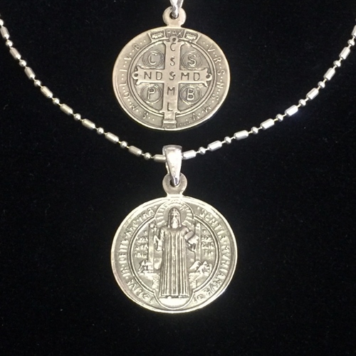 Large St. Benedict medal on 30" bead-ball chain, both in sterling silver. Medal is 7/8" diameter with 1 1/4" drop. Smaller medal is available, see sterling silver. Other chain styles and lengths available, call or email for pricing and options. Price includes shipping.