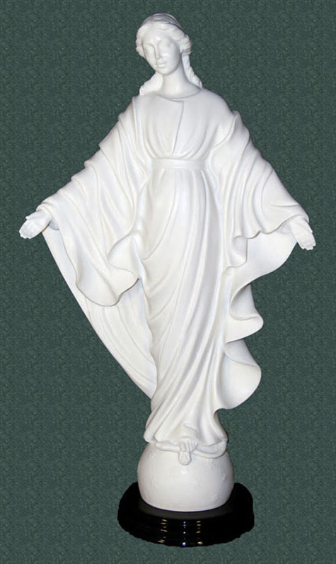 Our Lady of the Smiles by Ennio Furiesi in White Alabaster on a Quality Wood Base, 16"H. Made in Italy. Free shipping St. Therese of Lisieux believed that she was miraculously cured by Our Lady of the Smile. At the age of ten she became very ill and close to death.She saw the Blessed Mother smile and reach out to her. This began her miraculous healing.This statue is created in the likeness of the original statue in Therese's childhood bedroom.