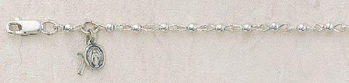 Beautiful, tiny baby bracelet makes a wonderful, keepsake gift for New Baby or Baptism. Sterling Silver. Claw clasp closure. Tiny Crucifix and Miraculous Medal attached. 3MM bead. 4.5"L Gift Box.