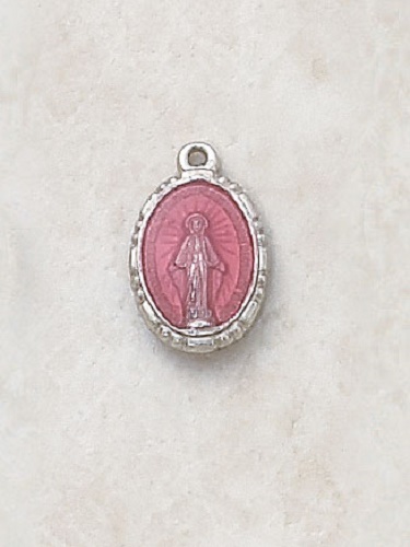 Beautiful Miraculous Medal is Sterling Silver with Pink Enamel. Miniature Medal is 1/2"H oval, perfect for a child or adult. Comes on an 18" Stainless Silver chain. Black leatherette gift box.