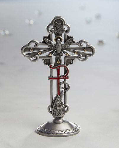 Beautiful Confirmation Cross makes a wonderful Keepsake Gift! It stands 6"H and features a Holy Spirit Dove with a gold enamel halo. Beneath the Dove are seven gold enamel flames representing the Seven Gifts of the Holy Spirit. Near the base of the cross is the Bishop's Mitre and Staff. A red enamel Chi-Ro representing the name of Christ stands at the center. Silver plated. Gift boxed.