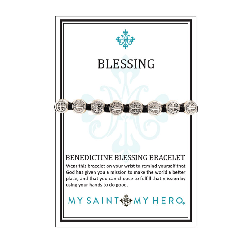 BENEDICTINE BLESSING BRACELET Wear this bracelet to remind yourself that God has given you a mission to make the world a better place, and that you can choose to fulfill that mission by using your hands to do good. Description Handwoven in Medjugorje, Bosnia and Herzegovina. This Benedictine Blessing Bracelet features 10 silver dipped Benedictine medals and our signature “blessed” tag. Each bracelet comes on a card telling the story of the powerful protection of the Benedictine medal. Medals made in Italy. This bracelet comes on cording with a sliding slipknot for an easy fit. 9.5” when fully opened. In Christian tradition, the Benedictine cross is one of the Church’s most powerful signs of divine protection. It was created in the mid 600’s as a symbol of the spiritual truths that enabled St. Benedict and his many followers to resist evil and do good. “The Holy Cross be my Light,” is written in Latin on the front of the cross, which is used all over the world to help spread Christ’s Kingdom of love and light. Wear this ancient symbol to help protect your soul, your loved ones and your home from anything contrary to God’s love.