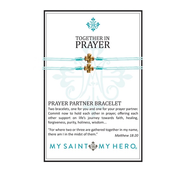 TOGETHER IN PRAYER Two bracelets, one for you and one for your prayer partner. Commit now to hold each other in prayer, offering each other support on life’s journey towards faith, healing, forgiveness, purity, holiness, wisdom… “For where two are gathered together in my name, there am I in the midst of them.” Matthew 18:20 Description Handwoven in Medjugorje, Bosnia and Herzegovina. Each Prayer Partner Bracelet features a gold dipped cross medal and our logo charm. The bracelets come displayed on a card with the reminder of the power of prayer. Medals made in Italy. These bracelets come on cording with a sliding slipknot for an easy fit. 9.5″ when fully opened.