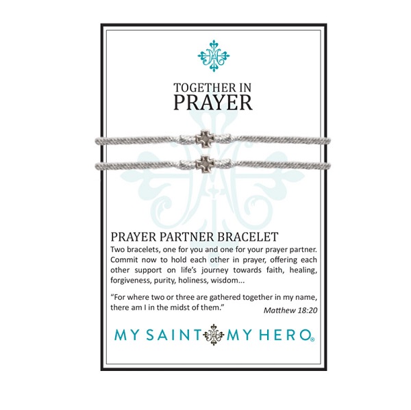 TOGETHER IN PRAYER Two bracelets, one for you and one for your prayer partner. Commit now to hold each other in prayer, offering each other support on life’s journey towards faith, healing, forgiveness, purity, holiness, wisdom… “For where two are gathered together in my name, there am I in the midst of them.” Matthew 18:20 Description Handwoven in Medjugorje, Bosnia and Herzegovina. Each Prayer Partner Bracelet features a silver dipped cross medal and our logo charm. The bracelets come displayed on a card with the reminder of the power of prayer. Medals made in Italy. These bracelets come on cording with a sliding slipknot for an easy fit. 9.5″ when fully opened.