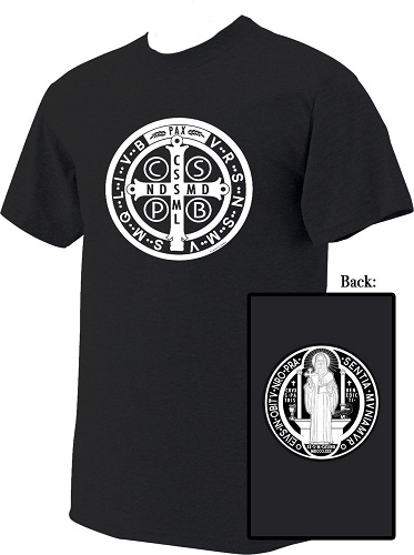 Share your faith with this shirt that incorporates an old Christian symbol. The Benedictine Medal was used by St. Benedict as a means of driving out evil and exorcising demons. The back of this shirt features the other side of the Benedictine Medal. This pre-shrunk, 100% cotton black t-shirt is available in sizes Small and XXX-Large. It is an excellent way to show and share your faith! **Please indicate size when ordering.