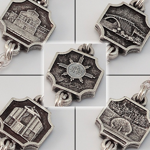 Beautiful St. Pio silver plated rosary with 7 x 5 mm brown wood beads. Our Father beads are represented by the “Places of Saint Pio” in antique silver plated finish, perfectly reproducing the Confessional, the Way of the Cross, the Shrine of Our Lady of Graces and the new Basilica The Centerpiece features St. Pio on one side and Our Lady of Graces on the reverse side. The crucifix is a perfect reproduction of the crucifix St. Pio was praying before when he received the stigmata. The corpus on the crucifix shows the five wounds of Christ in a red, hand enameled finish. Made in Italy